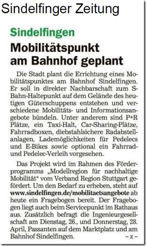 Trotz „Autoregion“ plant die Sindelfinger Stadtverwaltung einen Mobilitätspunkt am Sindelfinger Bahnhof, wie die SZBZ vom 21.4.2016 berichtet. Verschiedene Verkehrsträger sind dort an einem Platz verfügbar, sodass jeder bequem z.B. vom Fahrrad auf S-Bahn oder Car-Sharing umsteigen kann. In Fachkreisen spricht man von einem intermodalen Verkehr, also die Benutzung von mehreren Verkehrsträgern während einer Fahrt oder Reise.